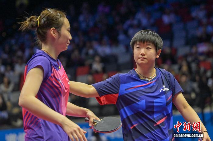 图为孙颖莎(左)正在角逐场上。记者 旧永诺 摄